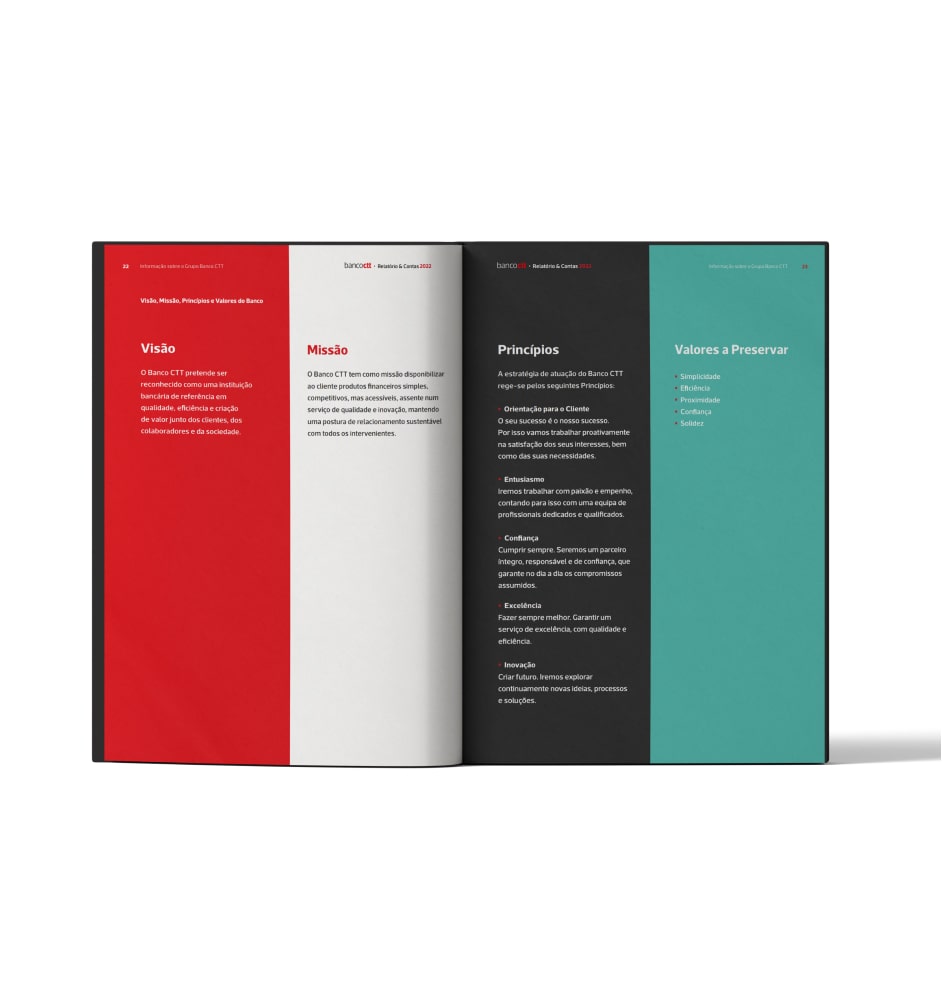 The Banco CTT Annual Report is an annual document that should inspire and appeal to the interest of shareholders, as well as customers and employees of the company. Because it is based mostly on facts, it is capable of generating trust in the company. Furthermore, it is an opportunity to reinforce the business’s personality and brand, and should be the result of a balance between facts, design, and engaging content that shares the company’s story over the year.